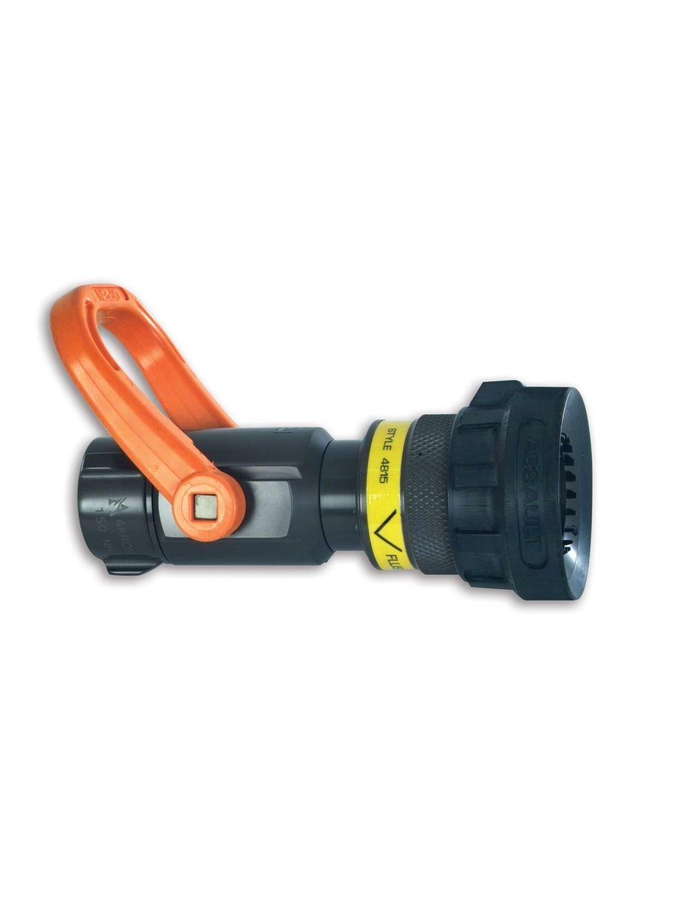 A lightweight fog and straight stream nozzle with multiple gallonage settings shall be provided. The nozzle shall have the option of spinning turbine teeth, molded teeth or no teeth, feature multiple flow indicating detents for 30, 60, 95, 125, and 150 gpm (115, 230, 360, 475, and 550 lpm) at 75, 87 or 100 psi (5, 6 or 7 bar) and 115, 230, 475, and 550 lpm at 87 psi (6 bar), a one-piece solid nylon reinforced bumper, one-piece solid rubber-like handle with dual stops, dual drive trunnions, and an extruded single piece Pyrolite body. The nozzle shall have an optional solid rubber-like pistol grip that can be easily removed. The nozzle also shall have a minimum 110° fog pattern, a full-time swivel inlet, be capable of flushing without shutting down or changing stream patterns, and a 5-year warranty. The nozzle must meet all aspects of NFPA 1964 with test results available.
