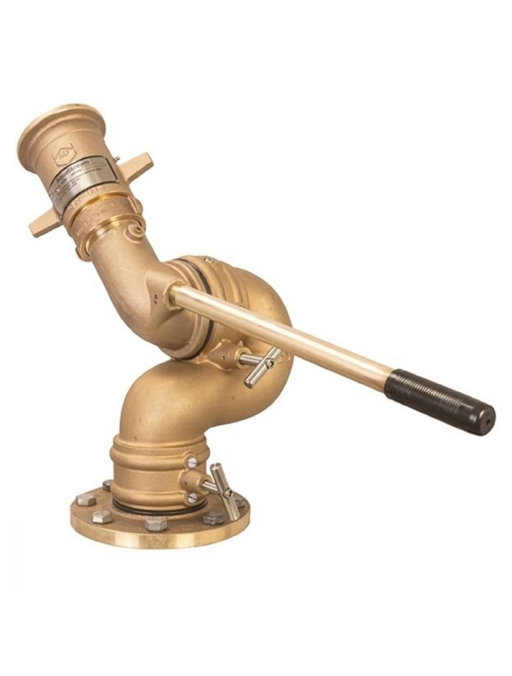 - A split waterway deck pipe with two handwheel controls.