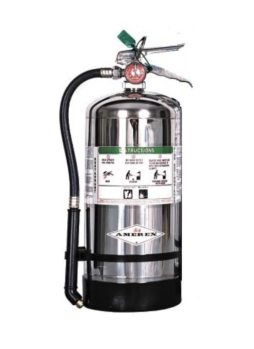 WET CHEMICAL extinguishers are the best restaurant kitchen appliance hand portable fire extinguishers you can purchase. Each model has been tested and approved for the Class K listing by UL specifically for restaurant kitchen hazards. They contain a special potassium acetate based agent. The recent trend to more efficient cooking appliances and use of vegetable based cooking oils dictates the use of a hand portable fire extinguisher with greater fire fighting capacity and cooling effect to combat these very hot and difficult fires. Available in two sizes – 6 liter or 2? gal. – with attractive stainless steel cylinders and easy to use hose and spray application nozzle. The superior fire fighting capability of the Wet Chemical agent is placed exactly where you aim it with no dry chemical residue to clean up. The Models B260 and B262 are the ideal “KITCHEN USE” fire extinguishers. They supplement existing cooking equipment automatic system protection for an extra margin of safety.