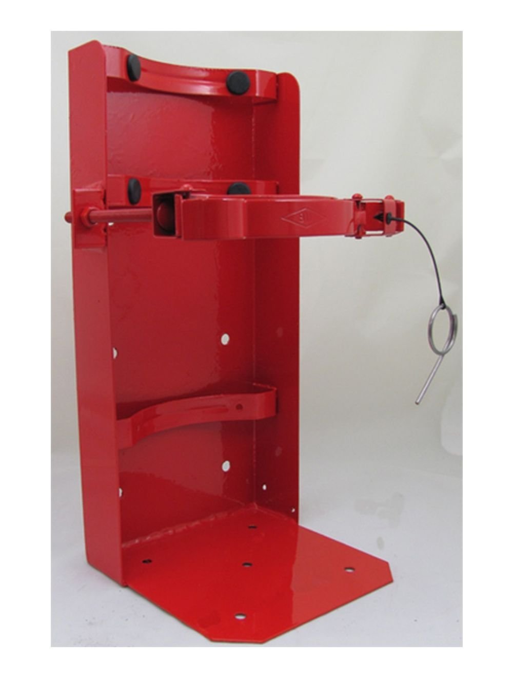 Heavy Duty Vehicle Bracket for 8″ cylinder diameter Fire Extinguishers, galvanized & painted red with locking pin for 30 pound extinguishers.