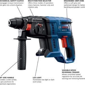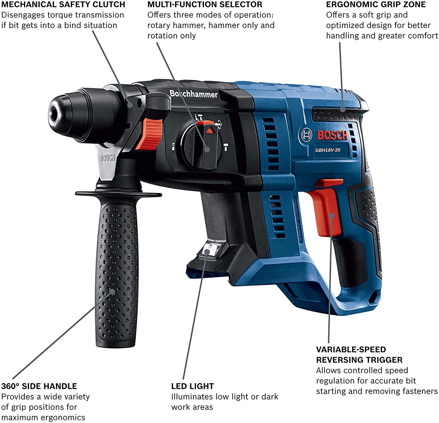 The Bosch GBH18V-20 18V 3/4-inch SDS-Plus? rotary hammer delivers an exceptional performance-to-weight ratio for anchoring in concrete, drilling in masonry, core cutting and chiseling. With 1.3 ft.-Lbs. Of impact energy and a no-load BPM rating of 0-4, 550, This hammer work as hard as the user. It provides three modes ? rotary hammer, rotation only and hammer only. The powerful GBH18V-20 requires a Bosch 18V 4.0 Ah battery or higher. This hammer works with Bosch PRO+GUARD? dust solutions ? an end-to-end dust-collection system that helps users move toward OSHA Silica dust compliance. At only 5.7 lbs. (Tool only, not including battery), It has an ergonomic design and soft-grip handle. It has electronic motor and cell protection to protect the tool and battery from overload.