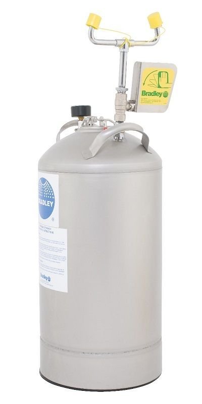 10-Gallon Pressurized Tank Twin Chrome-Plated Brass, Soft Flow, Eyewash Heads Highly Visible Yellow-Colored Drench Hose? Universal Identification Sign and Inspection Tag Included eye wash meets minimum water flow of 0.4 GPM at 30 PSI Drench hose (S19-690 only) meets minimum water flow of 3GPM at 30 PSI Maintains water flow for approximately 15 minutes from eye wash or 3? minutes from drench hose This pressurized portable emergency eyewash station features an 8-ft. drench hose with a handheld squeeze valve.