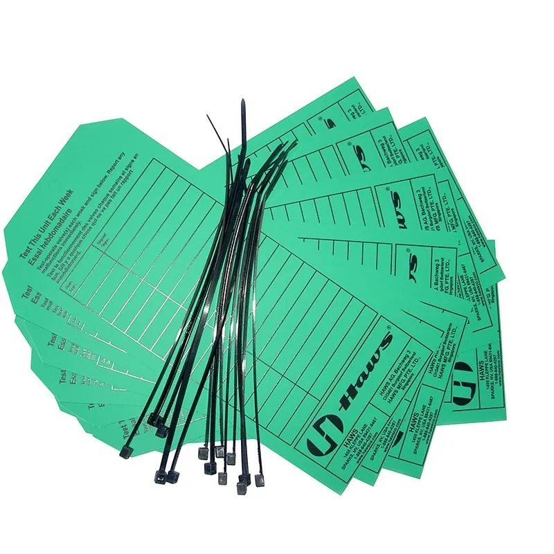 HAWS Model SP170 is a test card with space for date and initials of inspector. Used to record weekly testing of emergency equipment. Printed on water proof stock for a permanent record. Packaged in quantities of 25. Includes zip ties.