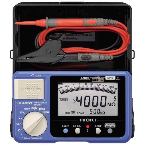 Hioki insulation testers or megohmmeters feature all-in-one designs including?built-in rugged cases and test lead storage compartments. The IR4057-50 is a 5-range, 50V to 1000V digital insulation resistance tester with bargraph, and delivers efficient functions and features to help shorten work time?associated with field insulation testing.