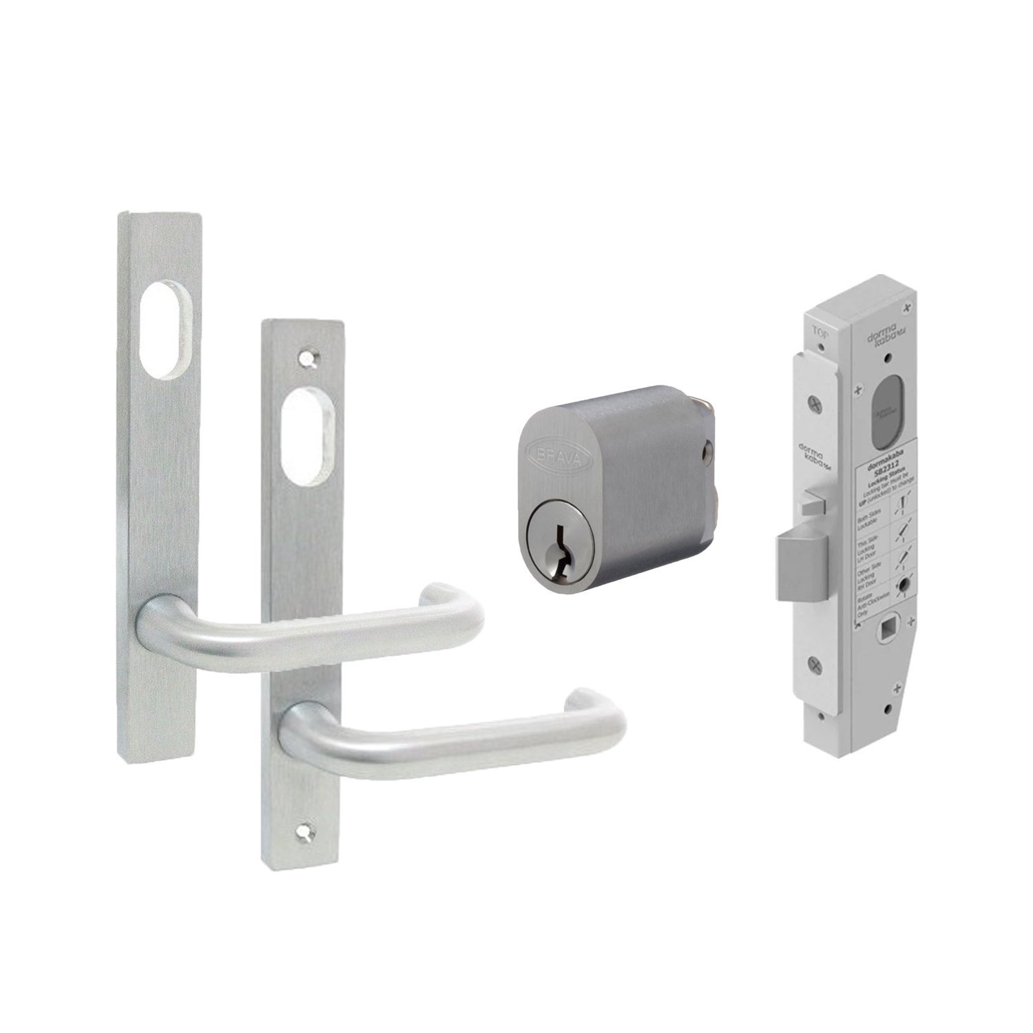 description: "Kaba SBM2 Short Backset Mortice Lock with Oval Cylinder and Lever SBM2KIT66 Mortice Lock provides more security on exterior doors that have windows. (e.g. When intruders attempt to break into a building through a window, the key lock on the inside of the door will stop them from entering) Mortice Lock Function - where the deadbolt locks by a key on both the exterior and interior of the lock. Latch is activated by turning the key or lever handle if fitted Includes: 1 x Dormakaba Mortice Door Lock 30mm Short Backset Includes Turn (SB2312SSS) 1 x Kaba N600 Series Narrow Style Plate Furniture w/ Cylinder Hole & 25 Lever (N601C25SCP) 1 x Kaba N600 Series Narrow Style Plate Furniture w/ Cylinder Hole & 25 Lever (N601V25SCP) 2 x Brava Oval Cylinder X W Z Rabbit Cams 6 Pin Keyed Alike Satin Chrome (5070USCKA) Dormakaba Mortice Door Lock SB2312SSS Features: Suitable for for commercial shop front doors Operated by key or handle outside or by turnsnib, key or handle inside. Cylinder or handle retracts the latch 15 mm stainless steel reversible latchbolt Stainless steel faceplate and strike. Easily adapted to most function Supplied with turn snib adaptor Compatible to most restricted keying systems Electric strike compatibility Specifications: Door Thickness: 32mm - 50mm Anti-lockout Function: No Compatible With Most Restricted Keying Systems: Yes Holdback Function Built-in: No Lock Grade: Commercial Backset: 30 mm Finish: Satin Stainless Steel Kaba N600 Series Narrow Style Squared Edge Plate Furniture w/ Cylinder Hole & 25 Lever N601C25SCP The Kaba N600 series narrow style square end solid forged brass door furniture is designed for use with contemporary Australian style short backset mortice locks and latches. Features : Rectangular narrow stile exterior square end plate. Cylinder hole and 25 series lever. Disabled access AS1428.1 compliant lever. Concealed fixing. Plates are designed to fit back to back. External plates supplied with fixing screws. Fire rated. Reversible handing Specifications: Door Thickness: 32mm - 50mm Height : 185mm Wide: 26mm Thick: 12mm Screw fixing centres: 158.8mm Finish: Satin Stainless Steel Compliance: This product comprises a BCA AS1428.1 -2009 compliant lever and has been Successfully tested up to 4 hours (depending on type of doorset) on fire door assemblies in accordance with Australian Standard AS 1905.1- 2005, Part 1: Fire Resistant Doorsets (only when used in conjunction with the M Series mortice lock) Kaba N600 Series Narrow Style Squared Edge Plate Furniture w/ Cylinder Hole & 25 Lever N601V25SCP The Kaba N600 series narrow style square end solid forged brass door furniture is designed for use with contemporary Australian style short backset mortice locks and latches. Features : Rectangular narrow stile interior square end plate Cylinder hole and 25 series lever Disabled access AS1428.1 compliant lever Visible fixing Plates are designed to fit back to back External plates supplied with fixing screws Fire rated Reversible handing Specifications: Door Thickness: 32mm - 50mm Screw Fixing Centre: 158.8mm Height : 185mm Wide: 26mm Thick: 12mm Finish: Satin Chrome Plate Compliance: This product comprises a BCA AS1428.1 -2009 compliant lever and has been Successfully tested up to 4 hours (depending on type of doorset) on fire door assemblies in accordance with Australian Standard AS 1905.1- 2005, Part 1: Fire Resistant Doorsets (only when used in conjunction with the M Series mortice lock) Brava 570 Oval Cylinder 5070USCKA Features: Brava type 570 cylinder Includes X, W, Z & Rabbit Cams 2 keys supplied Specifications: Cylinder: 6 Pin Keying: Keyed Alike Finish: Satin Chrome",