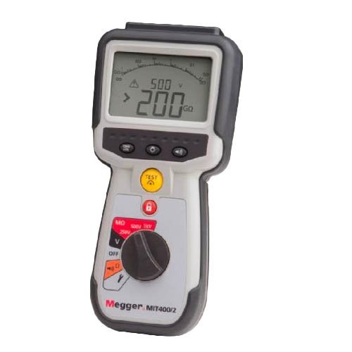 The Megger MIT400 series industrial insulation tester is an insulation resistance meter with built-in voltmeter for measuring insulation resistance, voltage, and continuity in electrical systems. The autoranging digital meter includes true root mean square (TRMS) and direct current (DC) voltage measurement. The dual LCD screen indicates test results either digitally or with an analog arc function to replicate the response of analog meters. The unit has a voltage detection test inhibit feature prevents testing when a circuit has a voltage of greater than 50V. The tester is safety rated to European Standard EN61010-1, Category IV, 600V and is also Ingress Protection 54 (IP54)-rated for protection against dust and splashing water. The Megger MIT400 series is commonly used by cable installers and maintenance workers.