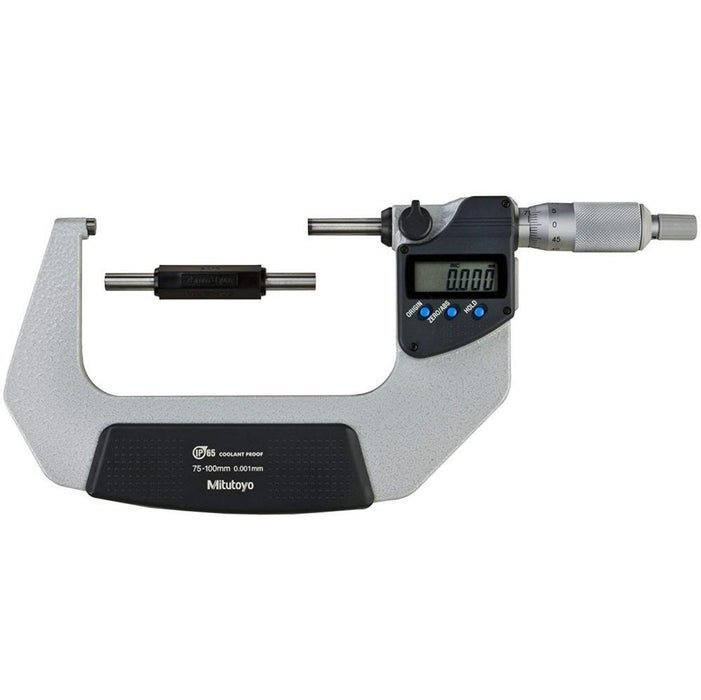 Mitutoyo new model 293-233-30 Digimatic micrometer features the NEW electromagnetic ABSOLUTE sensor, improving resistance to environmental conditions such as dirt, oil and water that can cause false readings. The coolant proof Micrometer has a measuring range of 75-100mm with SPC Data Output and a Ratchet Stop. This Series features IP65 level of protection, enabling use in environments exposed to cutting oil, etc., a Zero-set key for easy origin setting, Carbide tipped measuring faces and comes in a fitted plastic case. Also includes Automatic power on/off feature and data hold as well as low voltage and counting value composition error alarms.