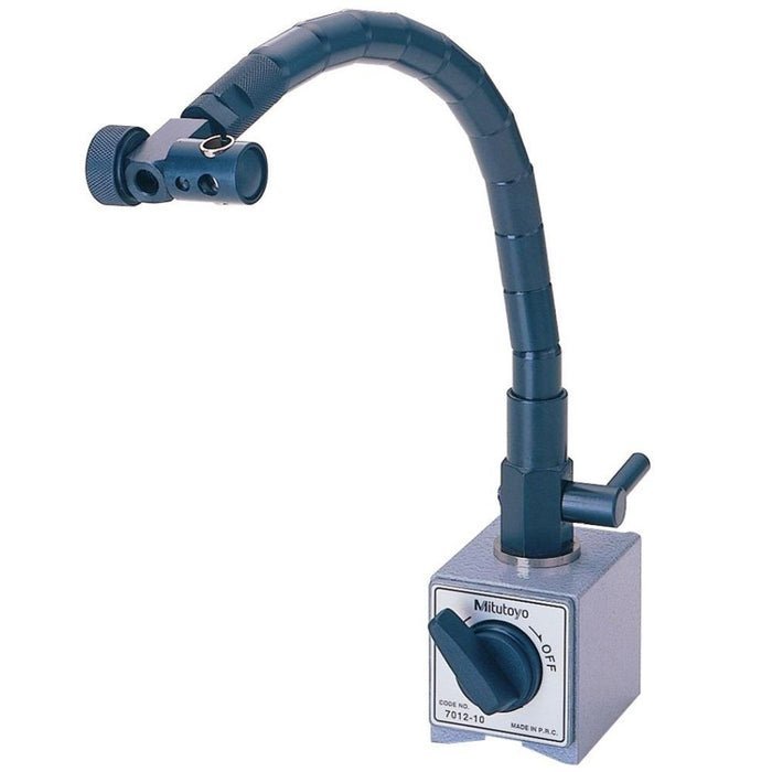 The Mitutoyo 7012-10 Flexible Magnetic Stand. These magnetic stands accept all AGD-type dial indicators, test indicators and probes that have .375″, 6mm or 8mm diameter shanks and or lug back with 1/4″ diameter mounting hole. The On/Off switch offers instant mounting and dismounting without any adverse effect to the indicators or work surface. Mitutoyo Magnetic Stands have 132 Lbf of magnetic force to help prevent damage to indicators and probes due to accidental base fall-over.