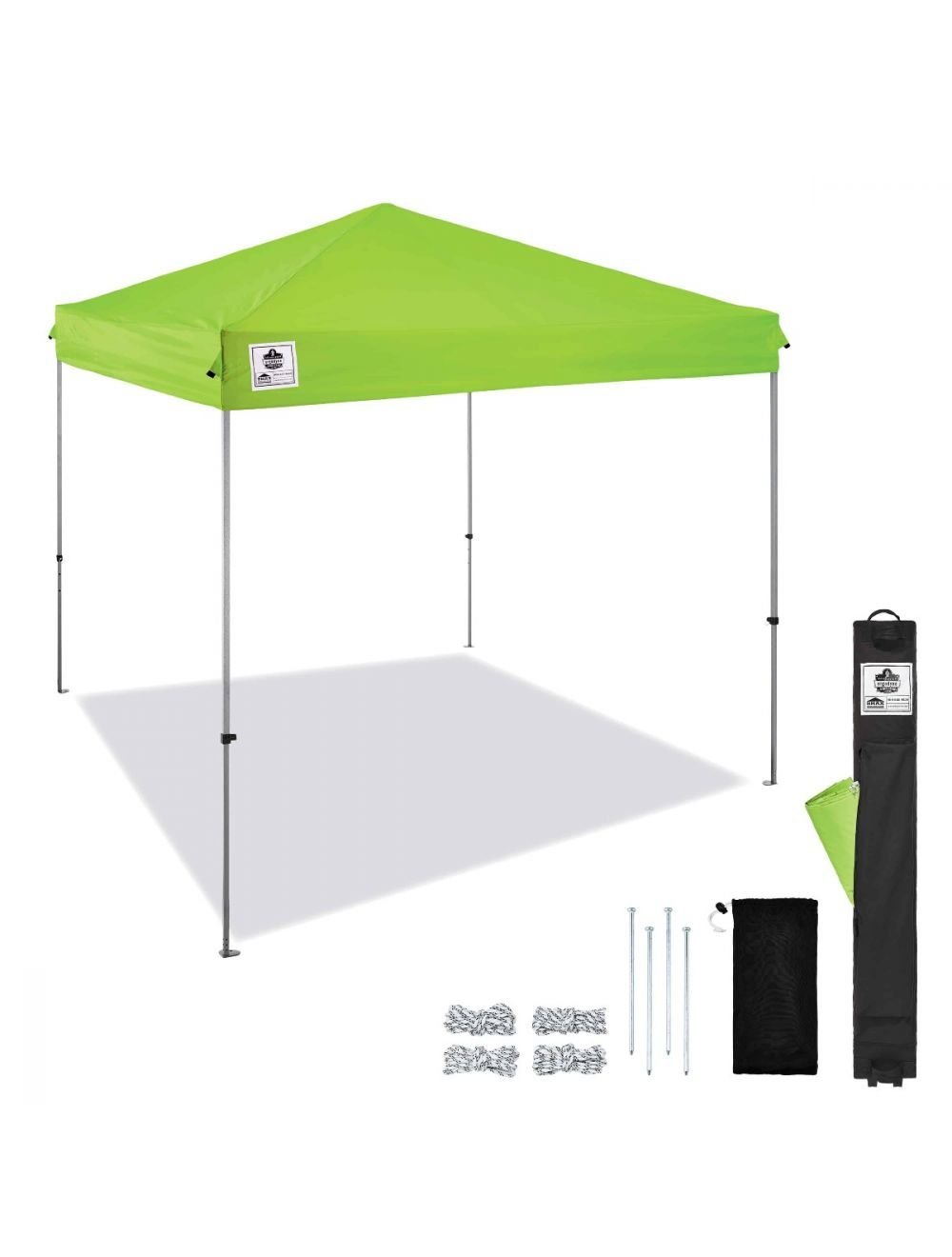 Made with thick, high-quality 210-denier polyester material, this heavy-duty 10 x 10 canopy also boasts waterproofing polyurethane coating (PU) and UV treatments as well as reinforced corners to withstand tough conditions. The hi-vis lime option and silver coating provide increased visibility on busy job sites or at events.