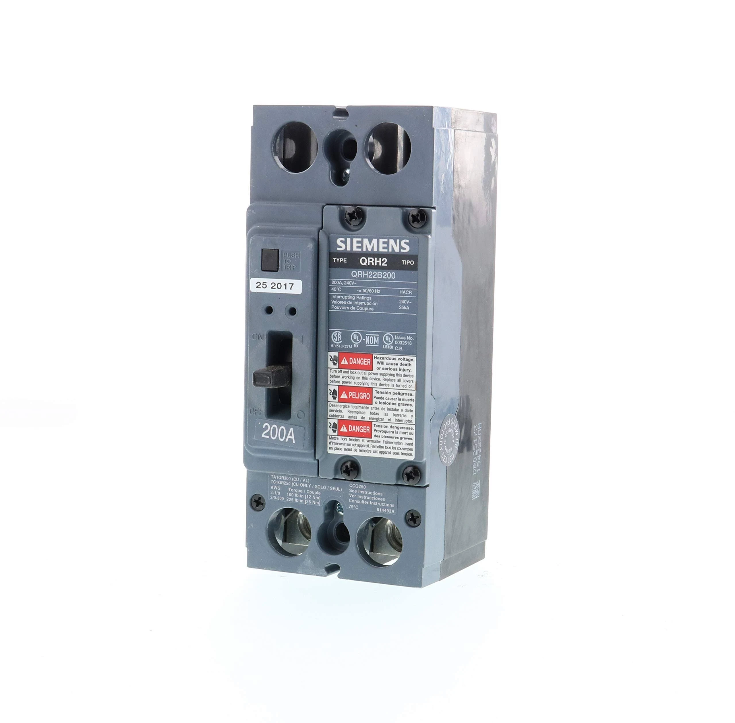 Siemens Low Voltage Molded Case Circuit Breakers General Purpose MCCBs, TM – are Circuit Protection Molded Case Circuit Breakers. 2-Pole circuit breaker Type QRH2 HACR rated. Rated 240V (200A). AIR (25 kA). Special features: UL listed for reverse feed applications, (AL) load side lugs installed.
