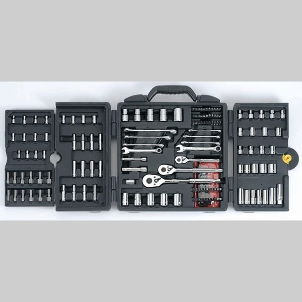Manufacturer ?Stanley Brand ?STANLEY Model ?96-011 Product Dimensions ?78.74 x 38.1 x 16.51 cm; 5.99 Kilograms Item model number ?96-011 Manufacturer Part Number ?96-011 Cover Included ?Blow Molded Carry Case, 1 x 1/4″ Dr. Pear Head Ratchet; 1 x 3/8″ Dr. Pear Head Ratchet; 1 x 1/2″ Dr. Pear Head Ratchet; 6 x 3/8″ Dr. Deep Sockets ? 6Pt; 1 x 3/8″ Dr. Spark Plug Sockets: 5/8″; 1 x 1/4″ Dr. Bit Holder; 1 x 1/4″ Dr. Extension Bar ? 3″; 1 x 3/8″ Dr. Extension Bar ? 3″, 6 x 1/4″ Sockets ? 6Pt; 12 x 1/4″ Deep Sockets ? 6Pt; 18 x 3/8″ Dr. Sockets ? 6Pt, 8 x Combination Wrenches; 55 x Specialty Bits; 26 x Hex Keys; 12 x Nut Bits Item Weight ?5.99 kg