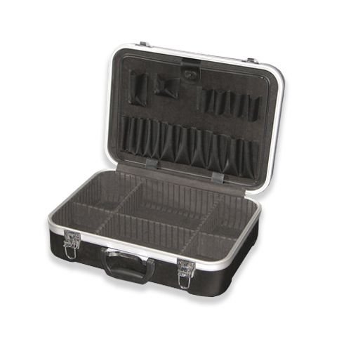Black ABS molded with extruded aluminum frame. Interior has one tool pallet and bottom dividers. With golf grip handle, chrome plated cast key locks.