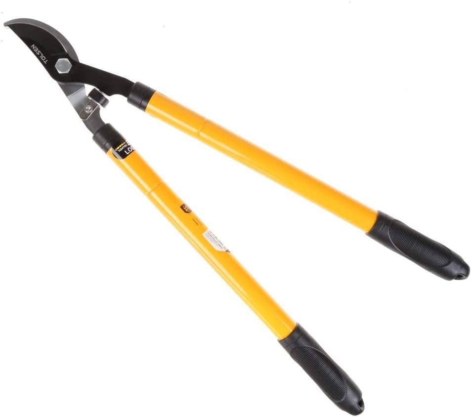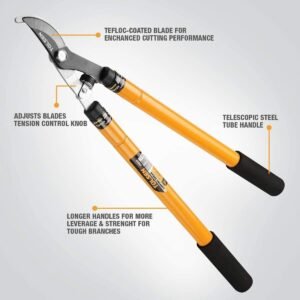 Lopping shear suitable for keeping your live shrubs and trees trimmed and in shape. Lopping shears are ideal for smoothly cutting small to medium twigs and large branches with minimal exertion. They are especially useful for removing diseased, damaged, dead, and unwanted or excess growth from shrubs and trees, as well as for shaping bushes and hedges. A bypass lopping shear works much like large scissors with long handles, with only one blade edge. When the handles are closed, the cut is made as the short, curved blade makes a pass besides the hook-shaped lower jaw positioned precisely against the blade. Both arms are made of 2-section telescopic steel tubing, that allows adjusting each arm to any length from 24 to 36 inches, providing maximum leverage and cutting power for tough jobs. A shock-absorbent rubber bumper serves to reduce jolt stress whenever the shear cuts through
