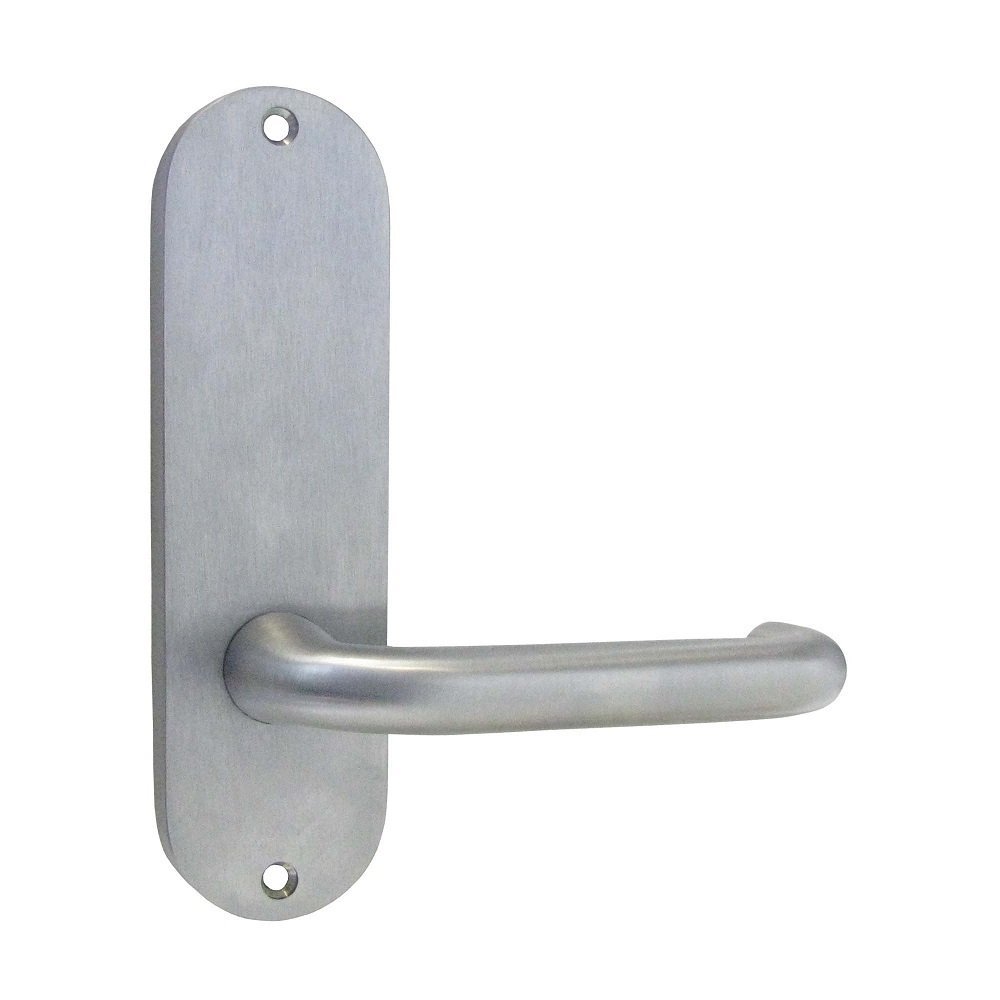 description: "Kaba 100 Series Rounded Edge Plate Furniture w/ 25 Lever 102V-25SCP The Kaba 100 series round end solid forged brass door furniture is designed for use with contemporary Australian style mortice locks and latches. Features: Stainless Steel drive plate, an integrated precision ground 12mm bush that provides enhanced handle support plus a lever torsion spring to eliminate handle sag. Fixing: Plates are 12mm thick and are designed to fit back to back with either concealed or visible fixing to outside plate. Tiebolt M5 fixing screws have a cross-recessed head. Handing: Plates and knobs are non-handed with levers reversible on site in most cases. Door Thickness: Plate door furniture suits door thickness from 32mm minimum to 50mm maximum. Thicker doors require extended spindles, turn bars and longer tiebolt fixing screws Specifications: Height : 165mm Wide : 44mm Thick: 12mm Finish : Satin Chrome Plate",